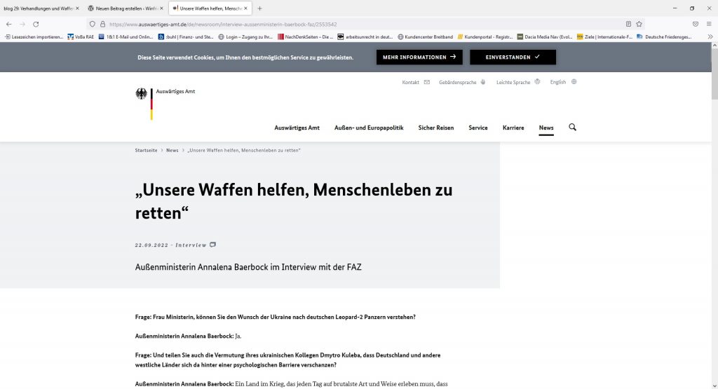Und in welch irrer Situation wir sind, können wir daran erkennen, dass vorvorgestern in diversen Zeitungen zu lesen war, dass unsere Außenministerin festgestellt hat: „Wir müssen der Ukraine Waffen liefern, weil unsere Waffen Leben retten.“ (Nachzulesen auf der Webseite des Auswärtigen Amtes) 1